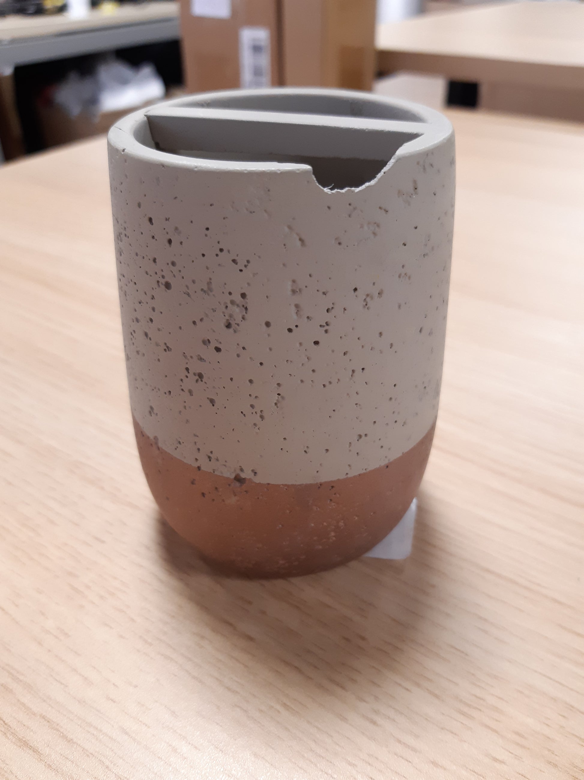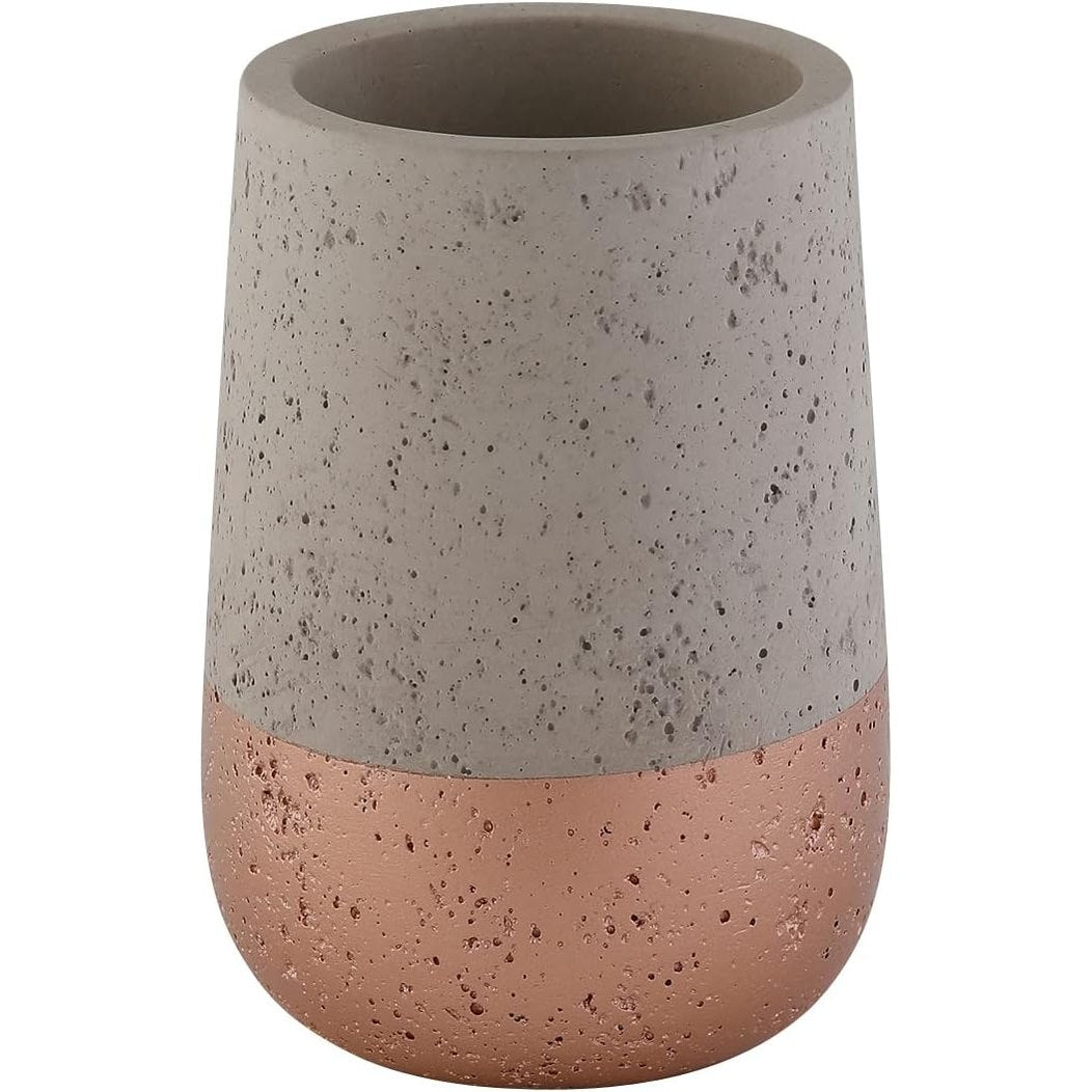 - Mbajtës furçash dhëmbësh i bërë nga beton gri me bazë të llakuar me ngjyrë të artë rozë.