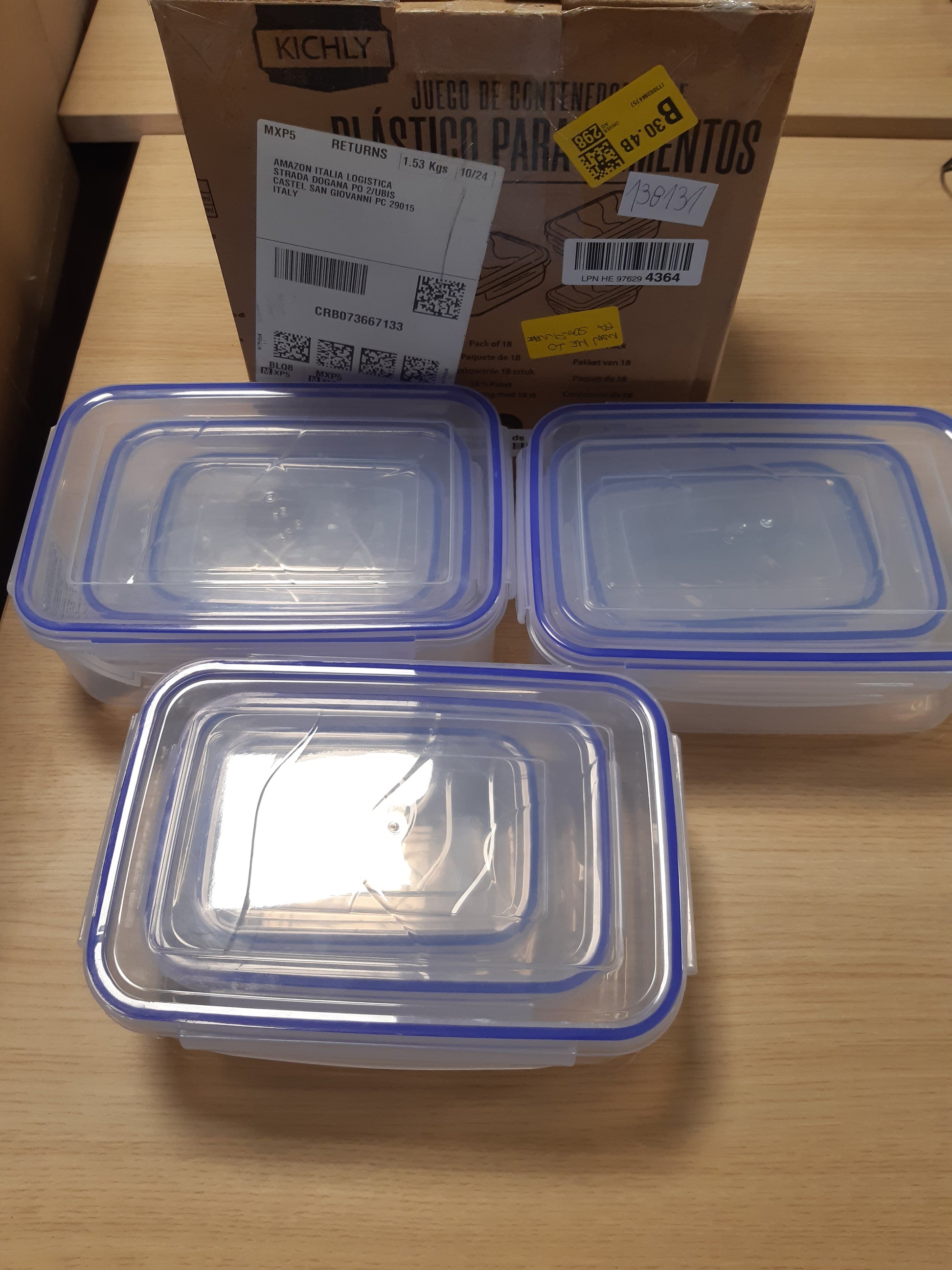 - Seti përbëhet nga 18 copë: 9 enë me kapacitet të ndryshëm (500 ml, 1220 ml, 2250 ml) dhe 9 kapakë përkatës.