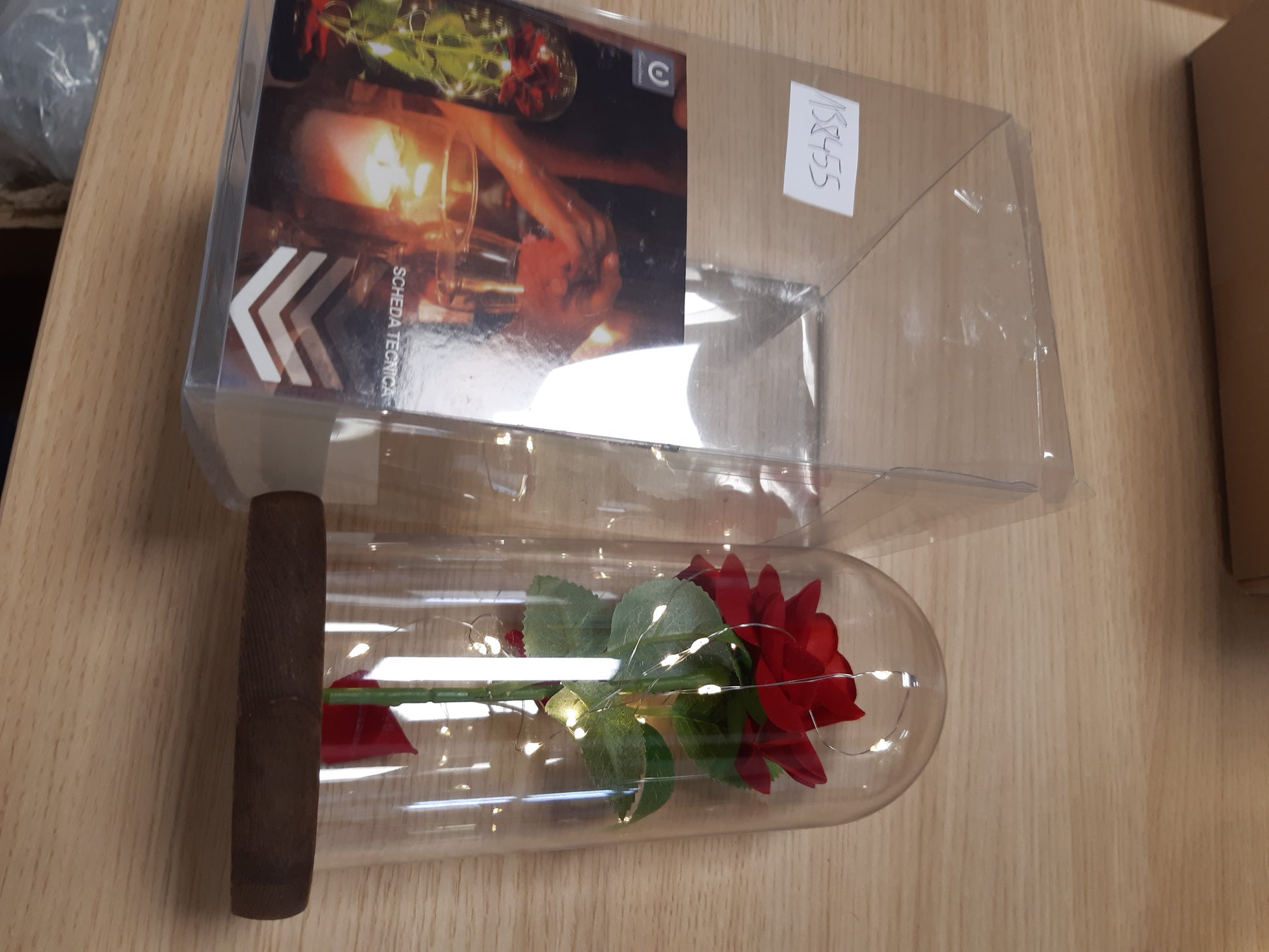 - Trëndafili i kuq është mbuluar me një zile xhami transparent, e cila e bën atë të duket më i bukur dhe e ndihmon të ruhet për një kohë të gjatë, pa pasur nevojë për ujë ose përkujdesje të veçantë.