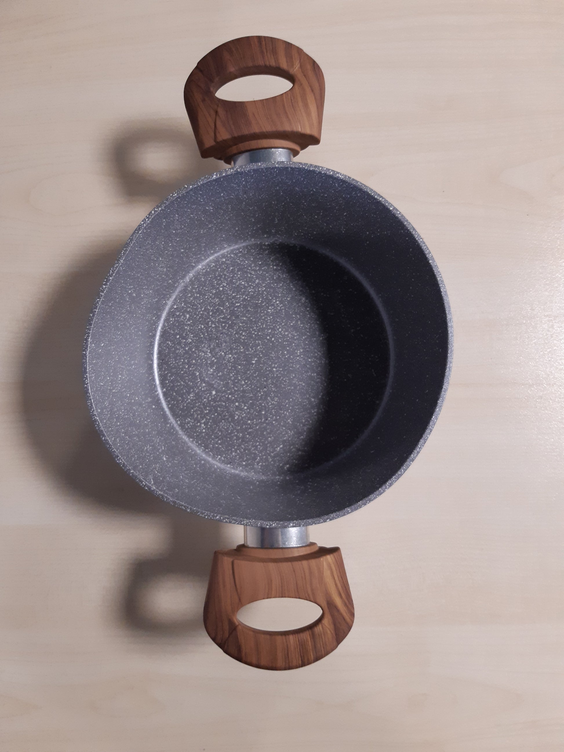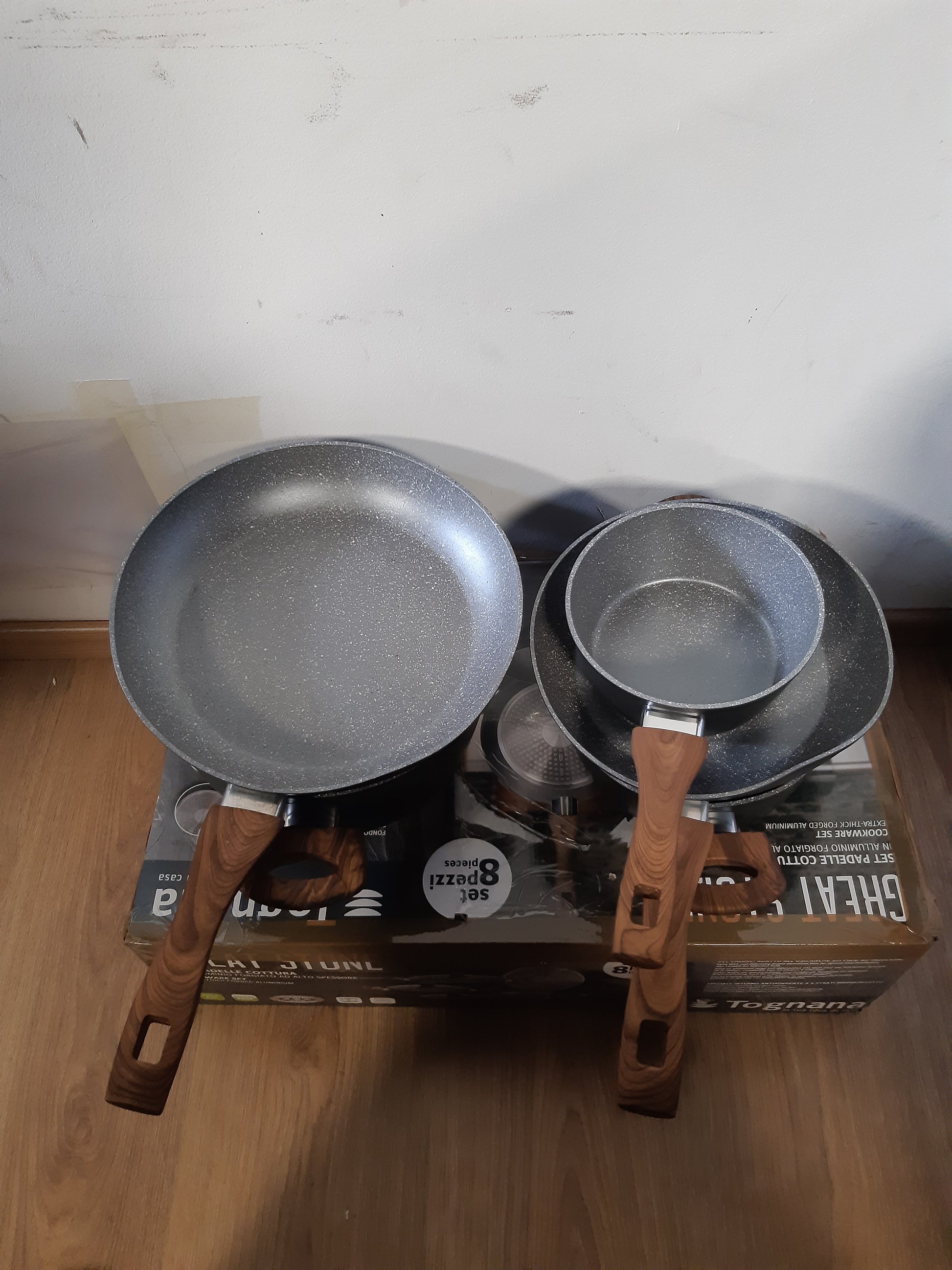 - Komplet prej 8 pjesë, përfshirë 2 tiganë, 3 tenxherë dhe 3 kapakë transparentë