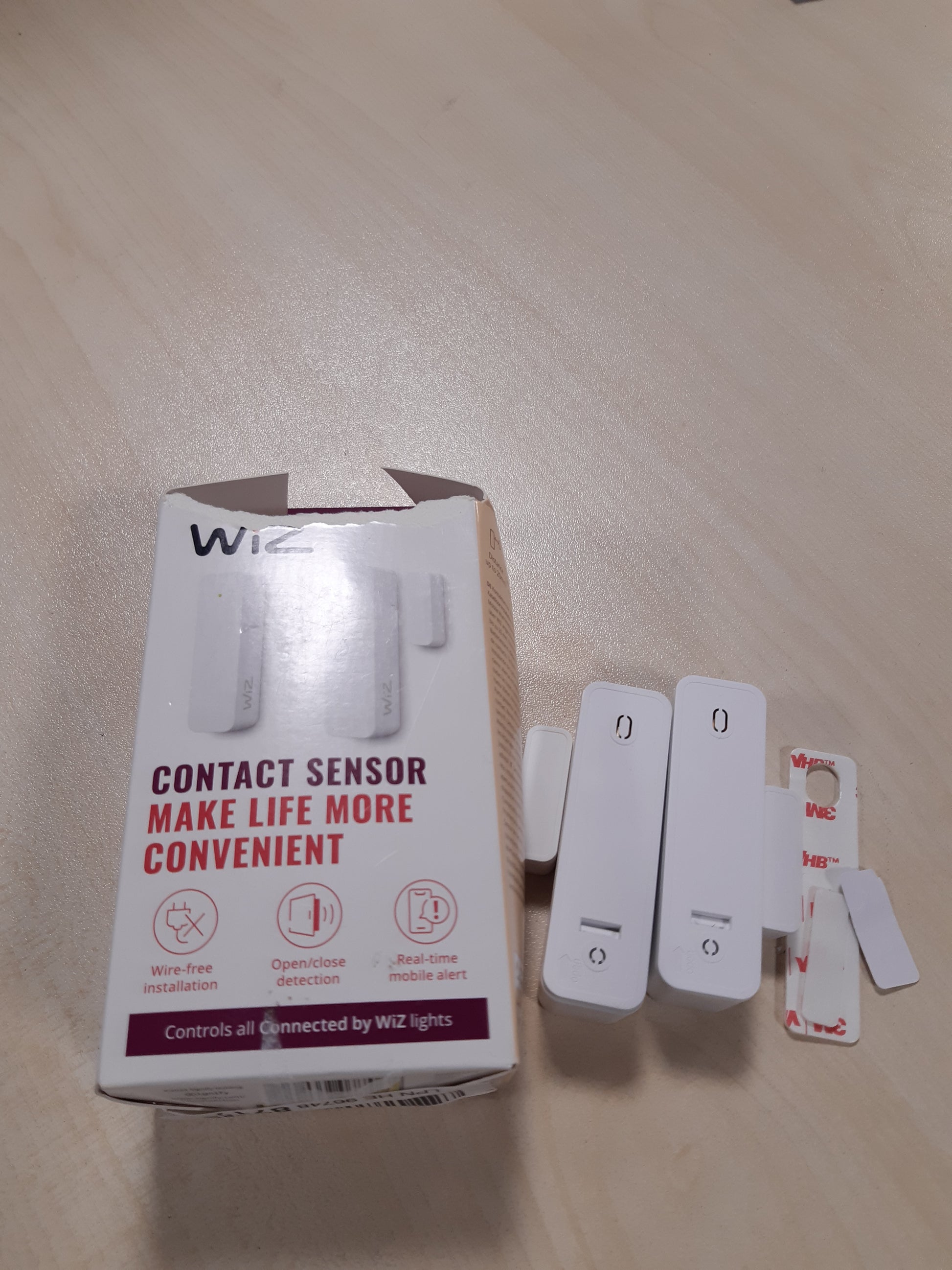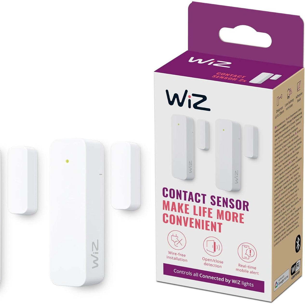- Sensori i kontaktit WiZ, i cili mund të instalohet lehtësisht në çdo derë ose dritare me anë të shiritit ngjitës të përfshirë, i jep mundësinë përdoruesit të monitorojë statusin e të gjitha sensorëve në çdo kohë dhe kudo me aplikacionin WiZ.