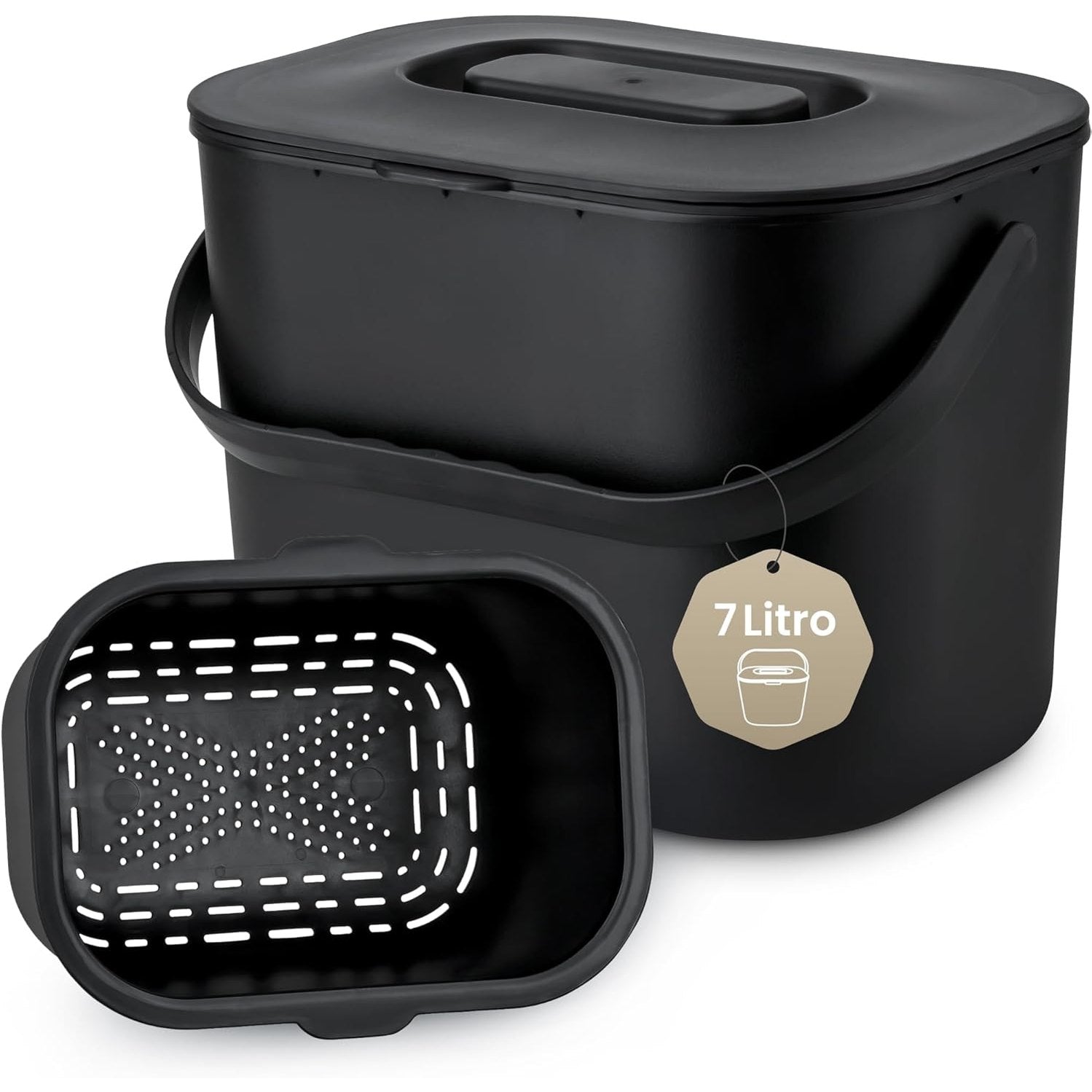 - Koshi i plehrave me kapacitet prej 7 litrash, me përmasa kompakte dhe një përfundim elegant të zi mat, i përshtatshëm për ambjente moderne dhe të vogla si apartamente ose zyra.