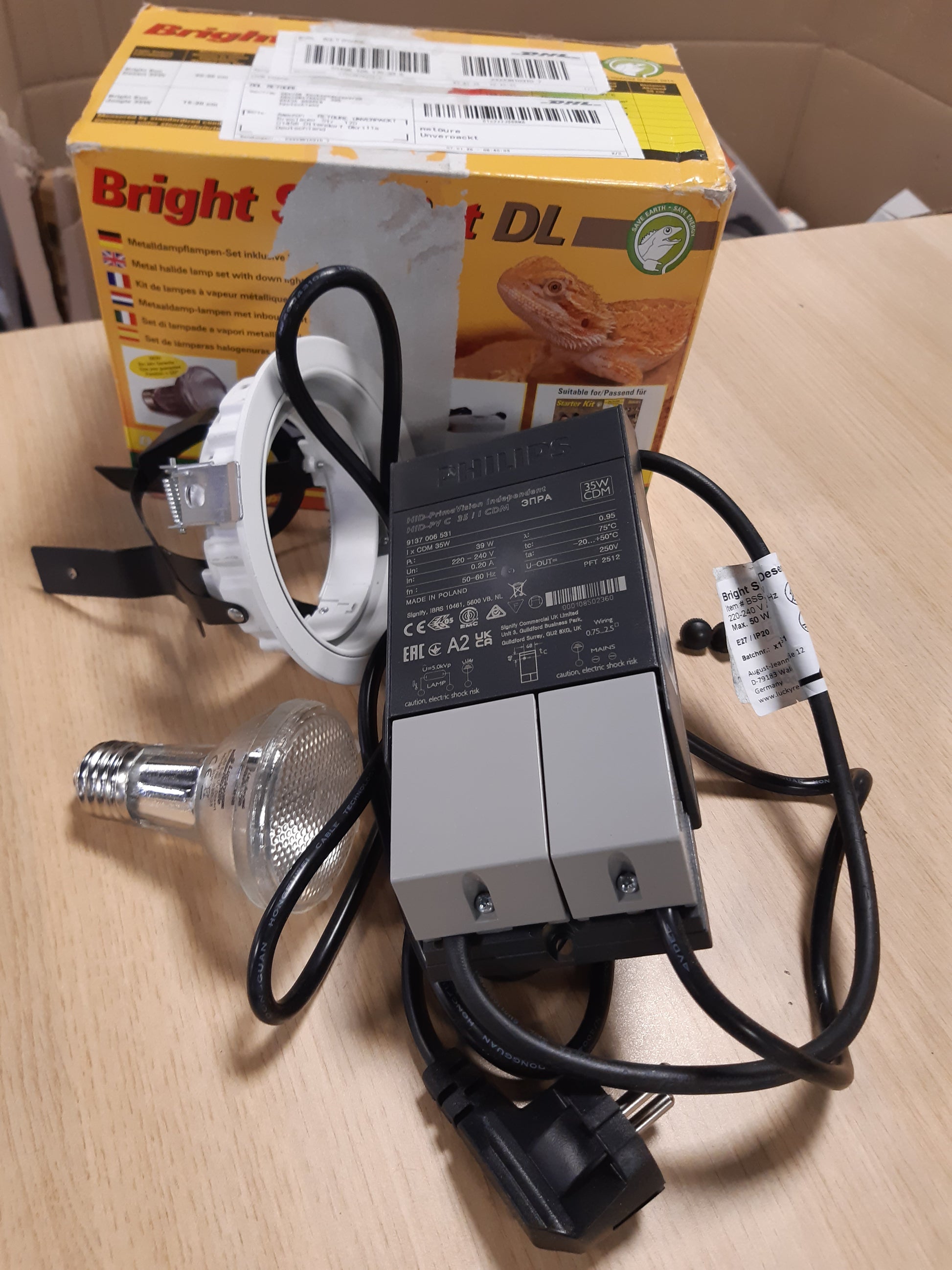 170042 - LUCKY REPTILE Bright Sun Set DL Desert - Llambë Halide Metalike të Bardhë 35W Për Terrarium, me Dritë të Fshehur dhe Balast, Spektër Drite si Dielli për Zvarranikësh, Set UV