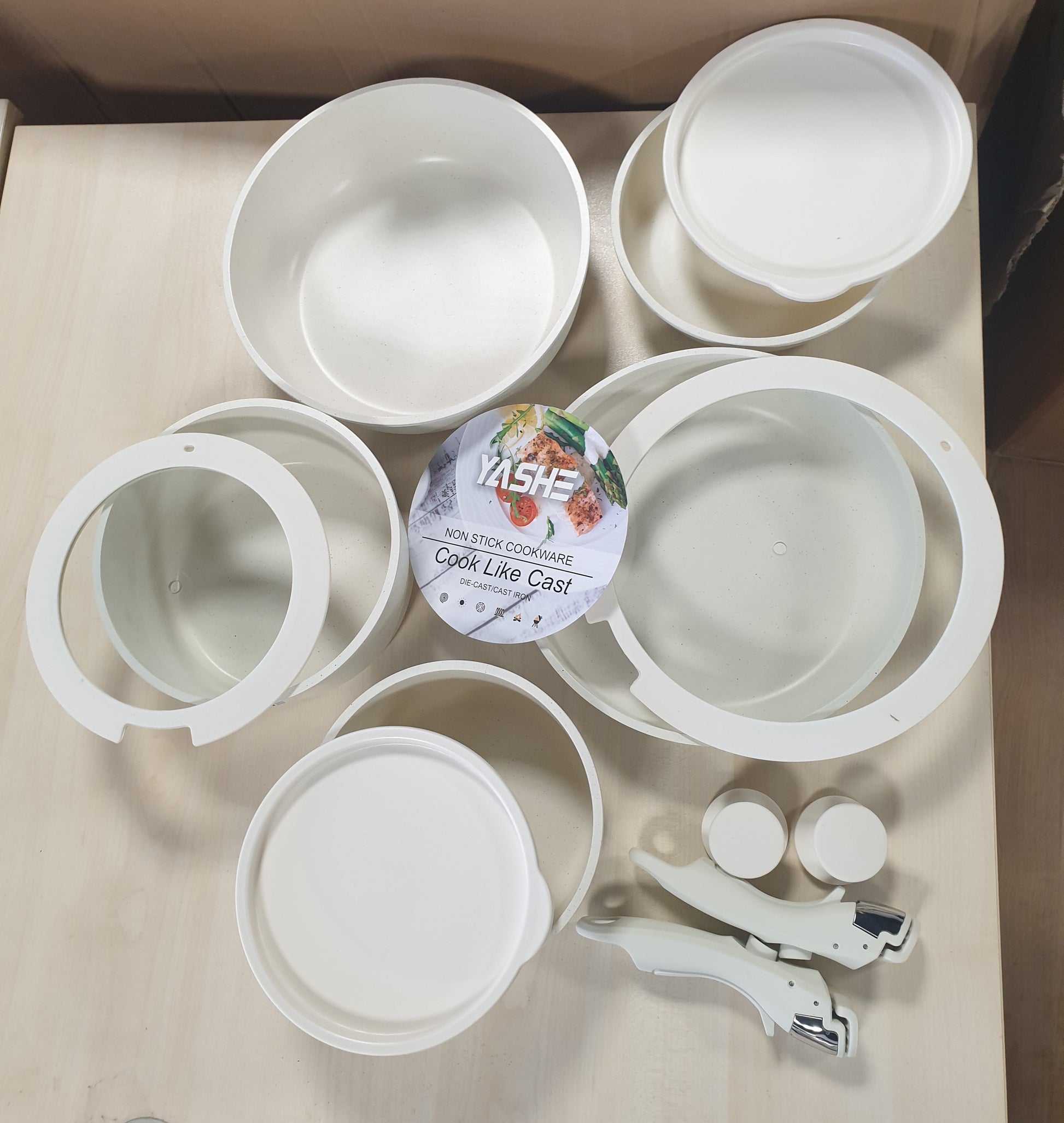 170045 - YASHE Set Enësh Gatimi 21 Pjesë, Tenxhere dhe Tiganë Jo-ngjitës me Doreza të Lëvizshme, Kapakë Qelqi, të Sigurt për Induksion dhe Furrë, të Mund të Vendosen Njëra mbi Tjetrën, të Bardha