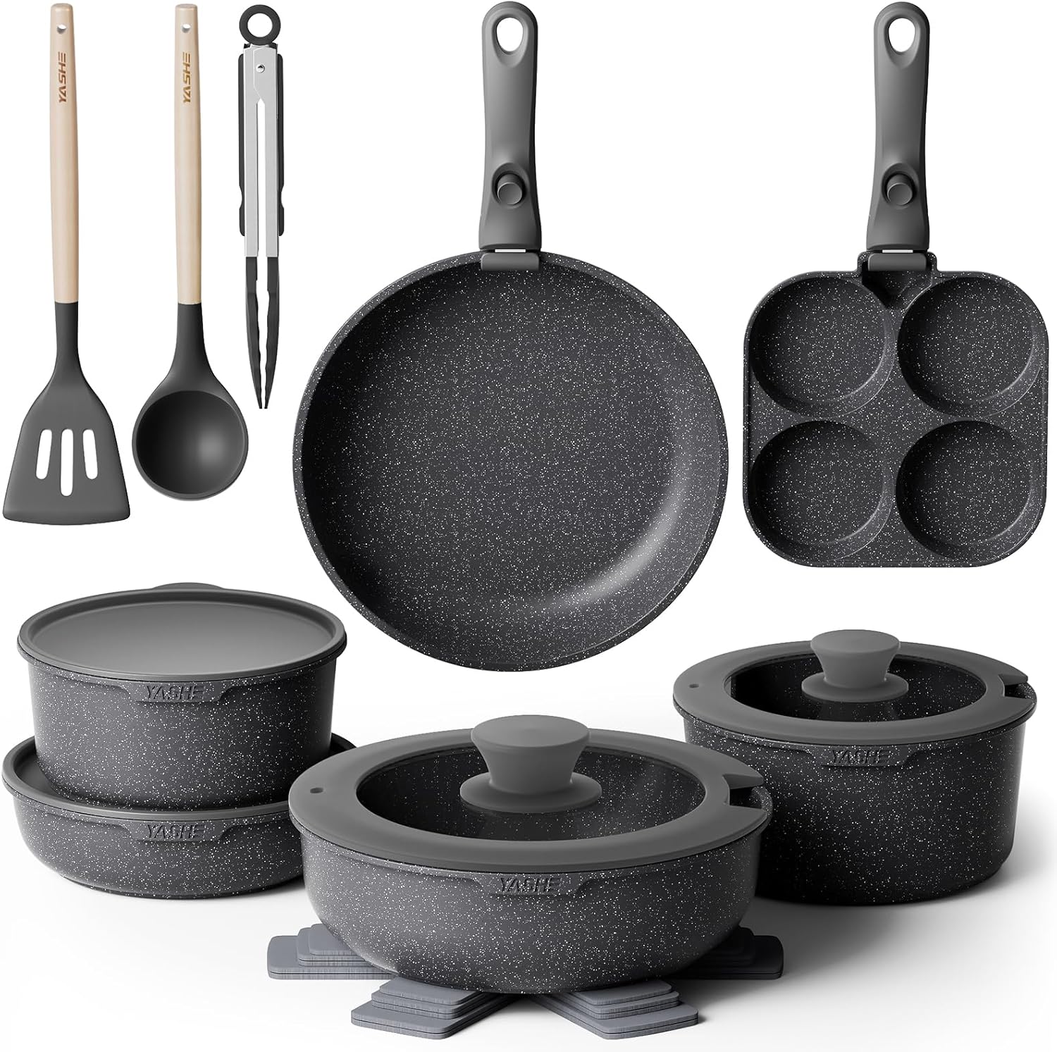 170051 - YASHE Seti i Enëve të Gatimit prej 20 Pjesë me Shtresën Jo-Ngjitëse, Doreza Të Lëvizshme, i Pajtueshëm me Induksion, i Sigurt për furrë deri në 230°C, i Sigurt për Lavastoviljen, i Mundshëm për t'u Vendosur mbi Njëra-Tjetrën, i Zi