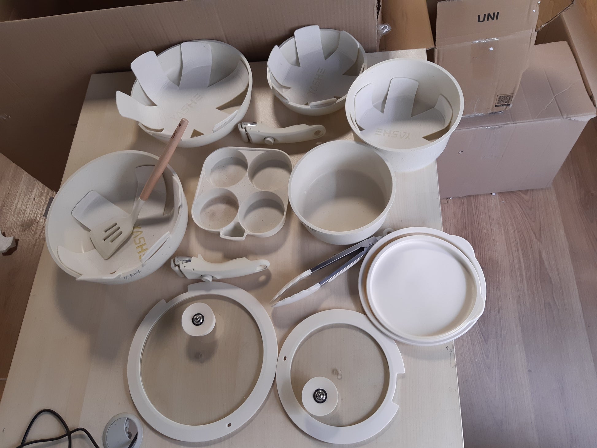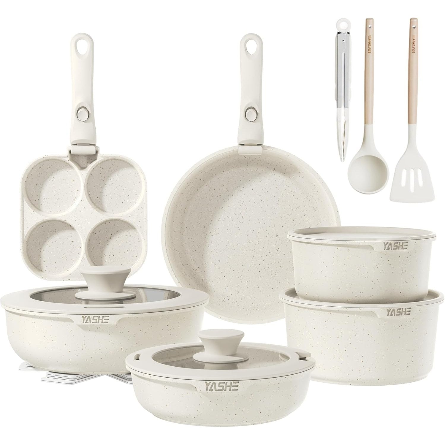 - Seti i tenxheresh dhe tiganësh YASHE ka 20 pjesë, me doreza të lëvizshme për përdorim të lehtë.