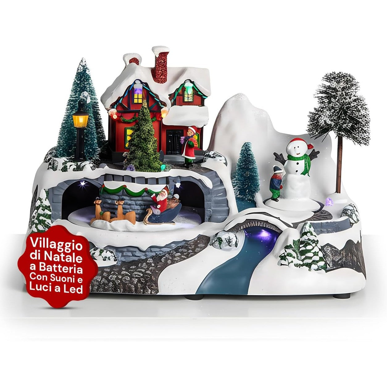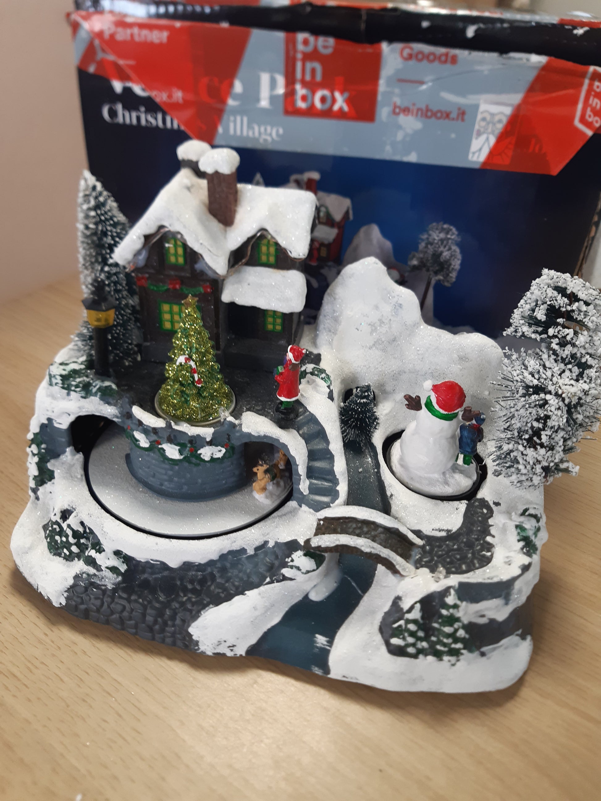- Atmosferë festive dhe realiste: Fshati i krishtlindjesh është punuar me dorë, i detajuar dhe i kompletuar me shtëpi të ndriçuara, personazhe, dhe një sajë në lëvizje.