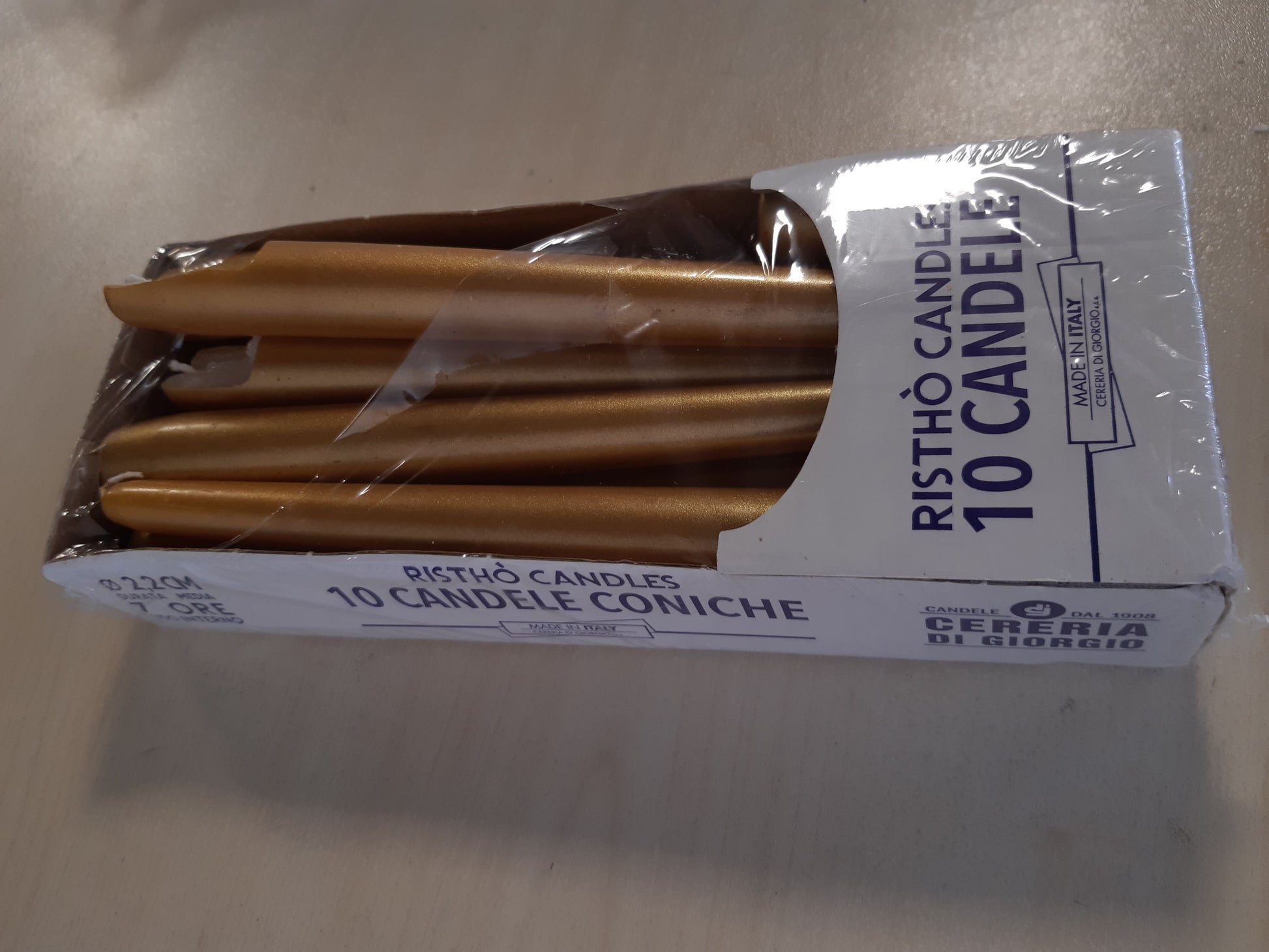 188338 - CERERIA DI GIORGIO - Seti prej 10 Qirinjve në Formë Koni, Ø 2.2 cm, Lartësi 25 cm, Ngjyrë Ari, Kohë Djegjeje 7 Orë, Pa Erë, Dyllë Vegan Natyral, Prodhuar në Itali
