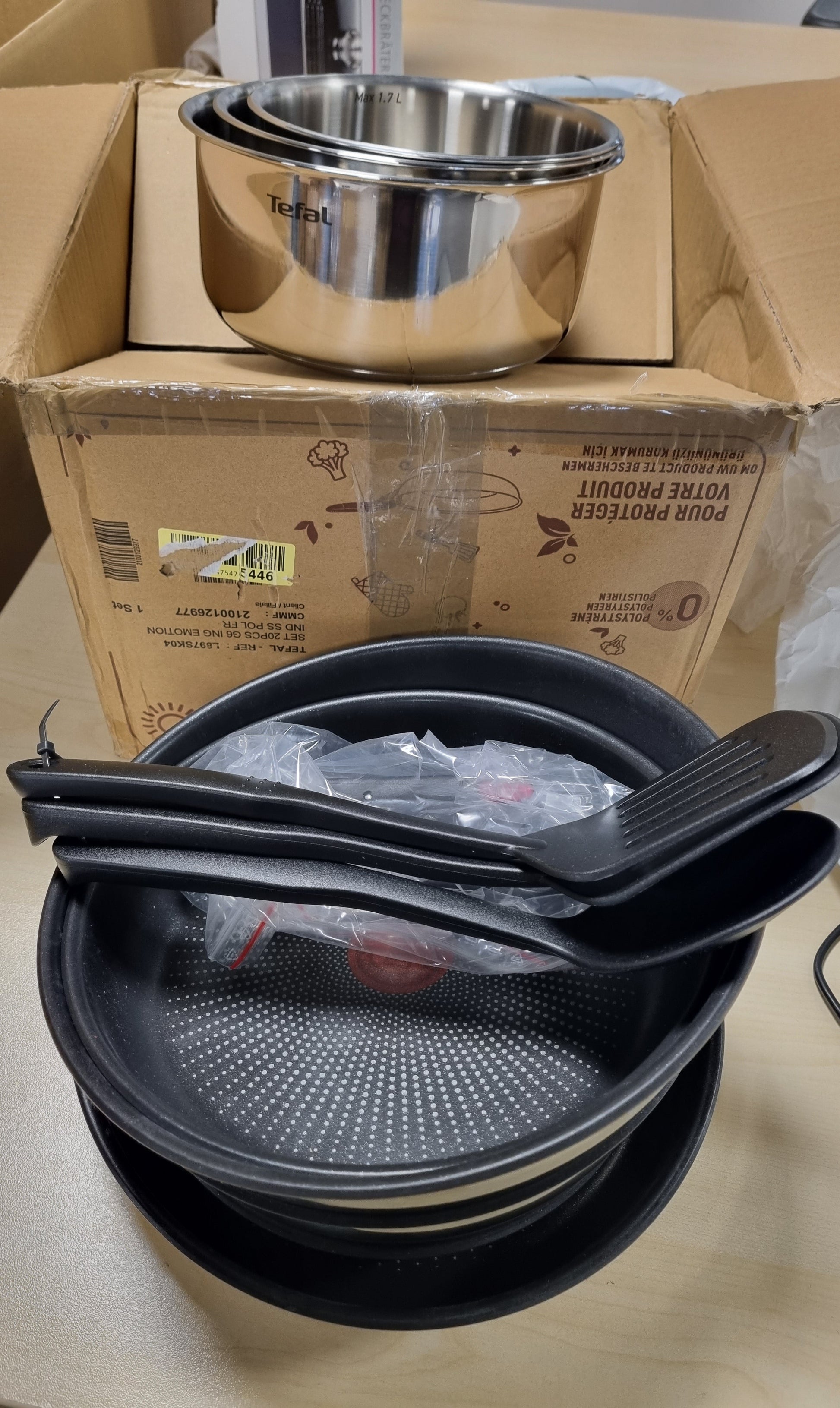 - Seti i gatimit përfshin 20 pjesë: tiganë 24 cm, tiganë 22/24/28 cm, tiganë 16/18/20 cm, wokpan 26 cm, kapakë hermetikë 16/18/20 cm, 4 mbrojtës tiganësh, 3 aksesore (lugë, spatulë, spatulë me vrima) dhe 2 doreza të lëvizshme.
