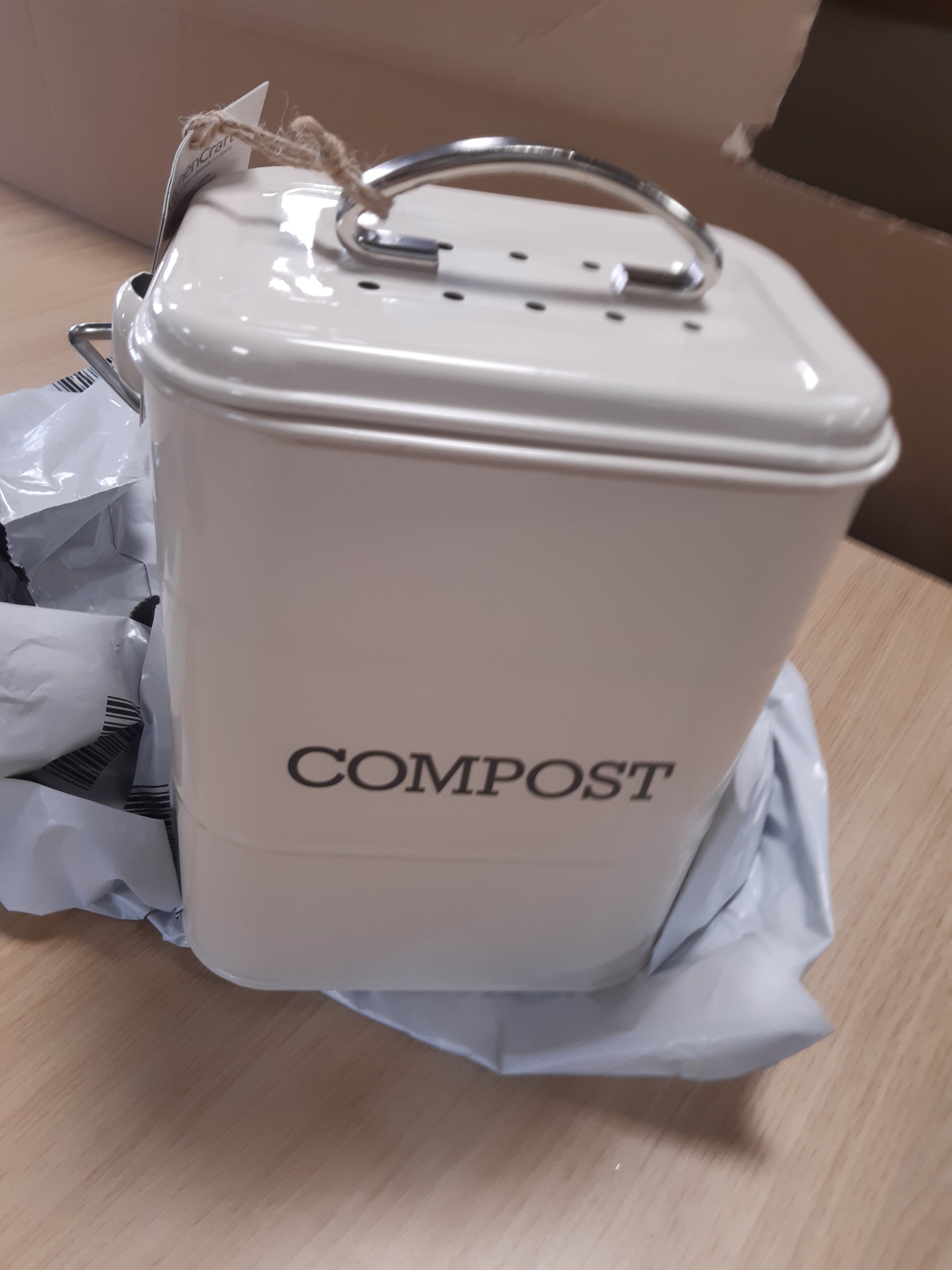 - Kosh plehrash 3 litra i Living Nostalgia me madhësi 16.5 cm x 12 cm x 24 cm, i ngjyrë krem antik dhe dorezë rrotulluese për ruajtjen e mbeturinave ushqimore.