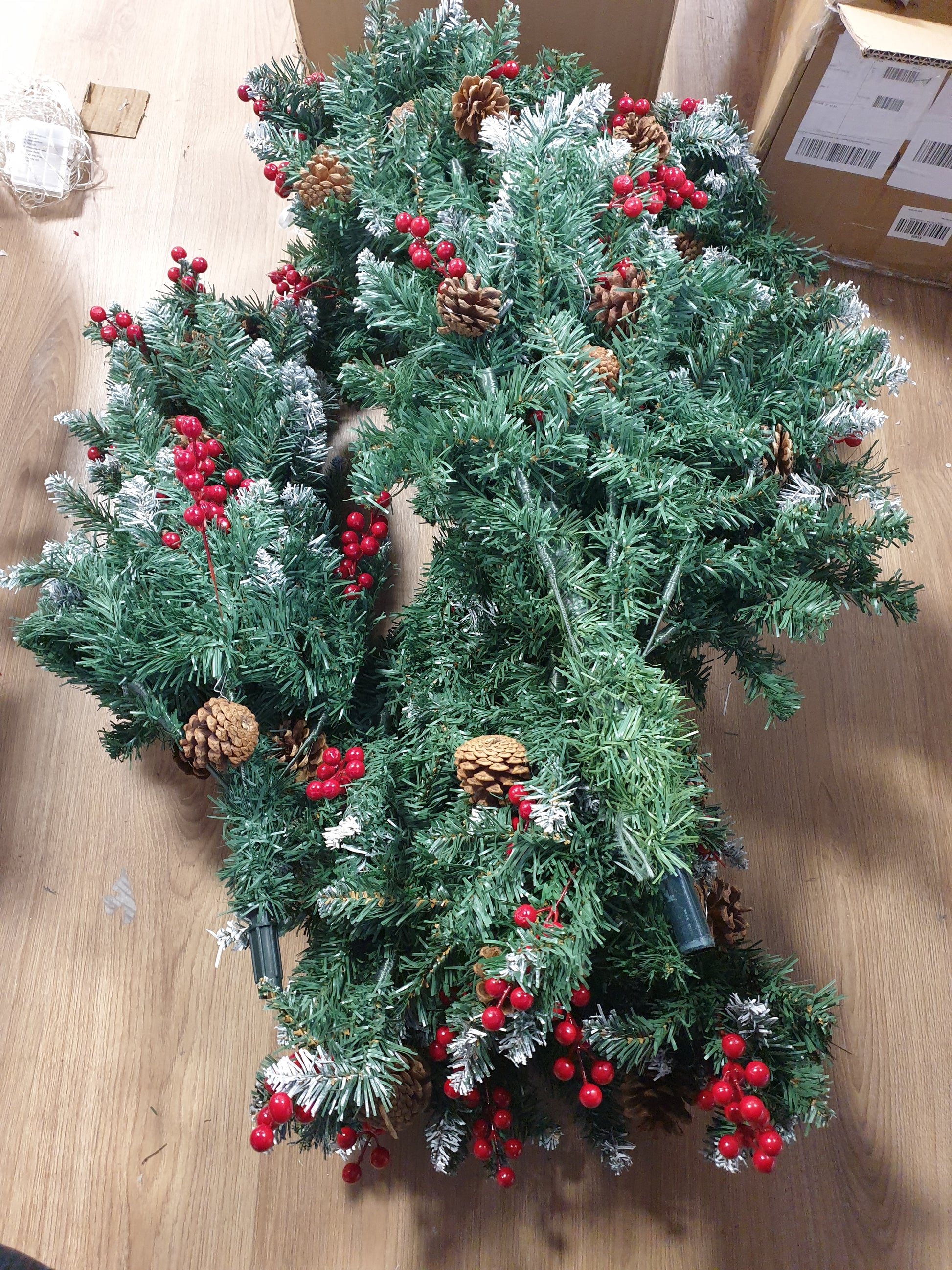 - Para-dekoruar: Pema vjen e dekoruar me boçe pishe artificiale dhe manaferra të kuqe, të shpërndara në mënyrë të barabartë nëpër degët, duke krijuar një atmosferë festive.