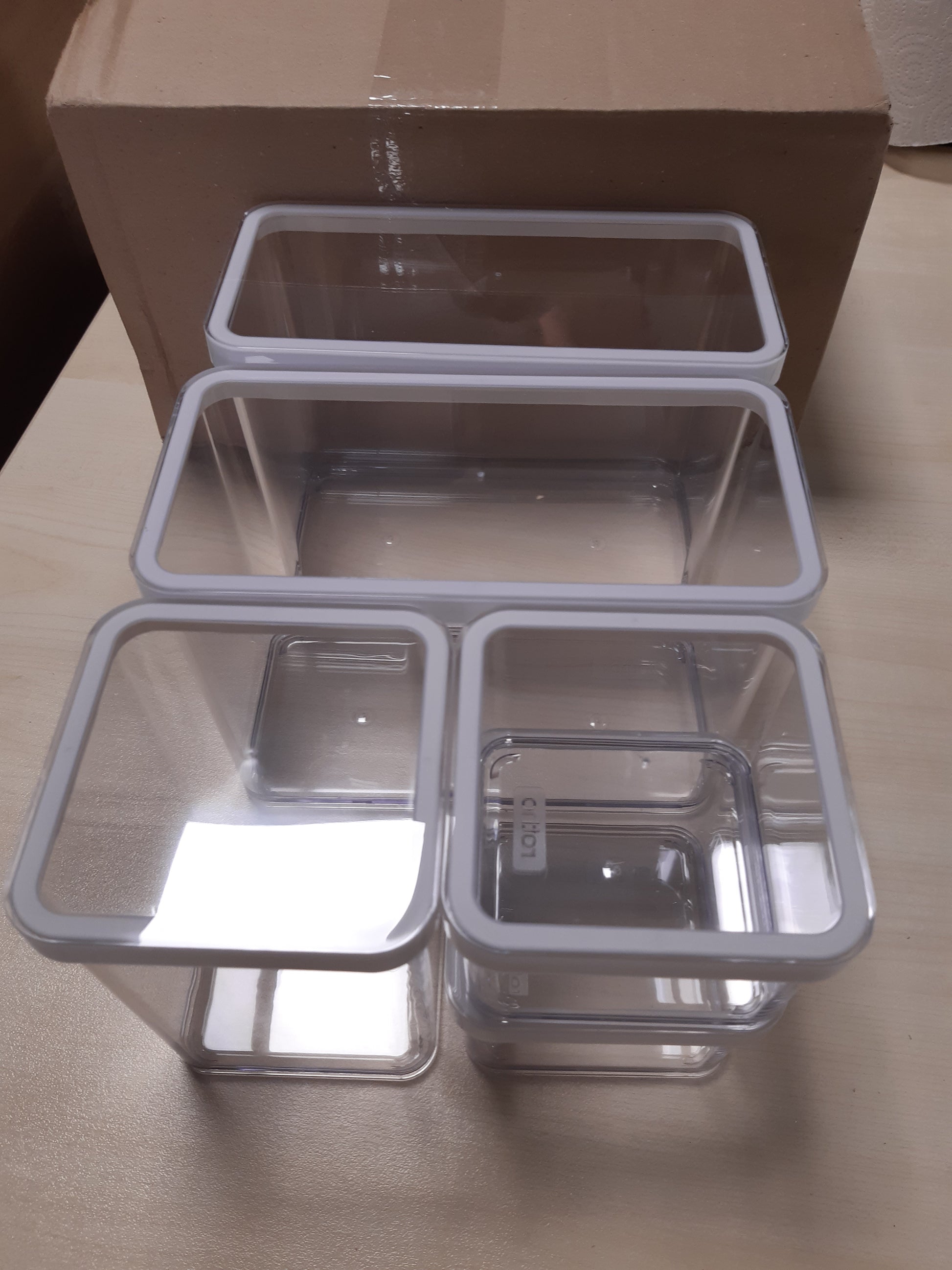 - Set i përbërë nga pesë kuti plastike (SAN) me cilësi të lartë për ruajtjen e ushqimit, i përfshirë 2 kuti me kapacitet 0.5L, 1 kuti 1.0L, dhe 2 kuti me kapacitet 2.1L.
