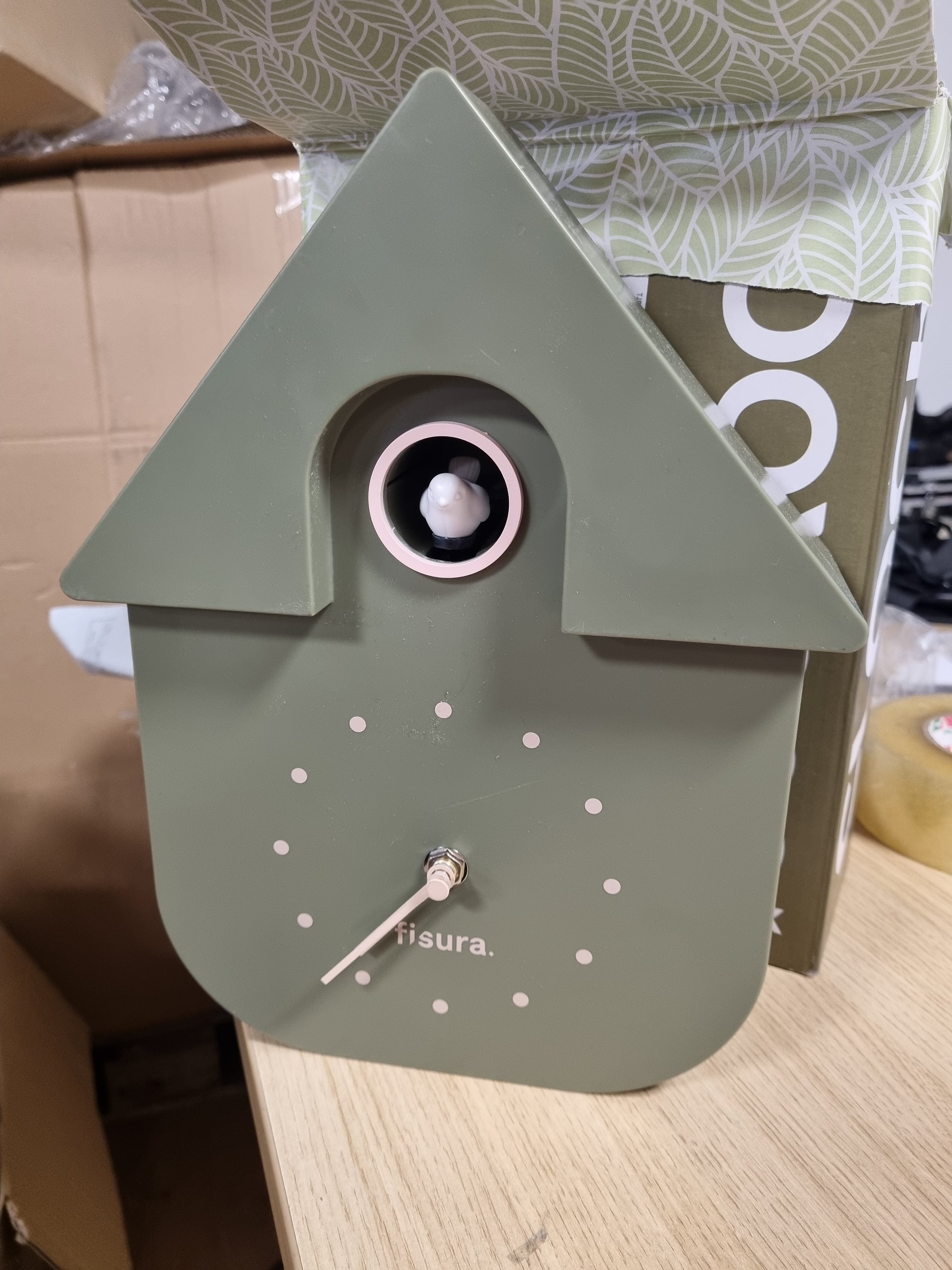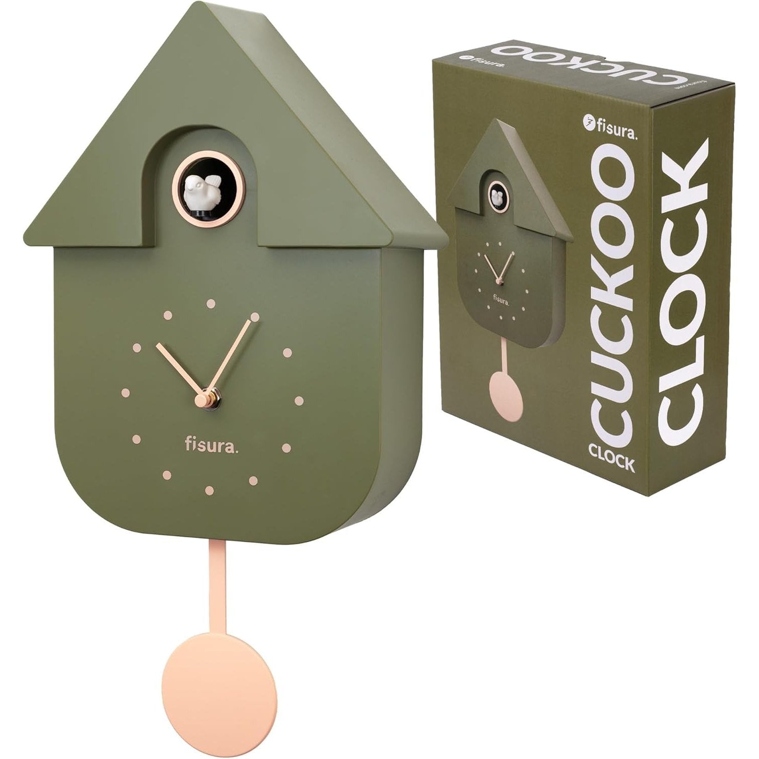 208197 - FISURA - Orë Muri në Formë Qyqeje, Materiali ABS, Ngjyra e Ullirit me Ekran Bezh, Përmasa 21.5x8x41.5 cm, kërkon 3 Bateri AA (E papërfshirë)