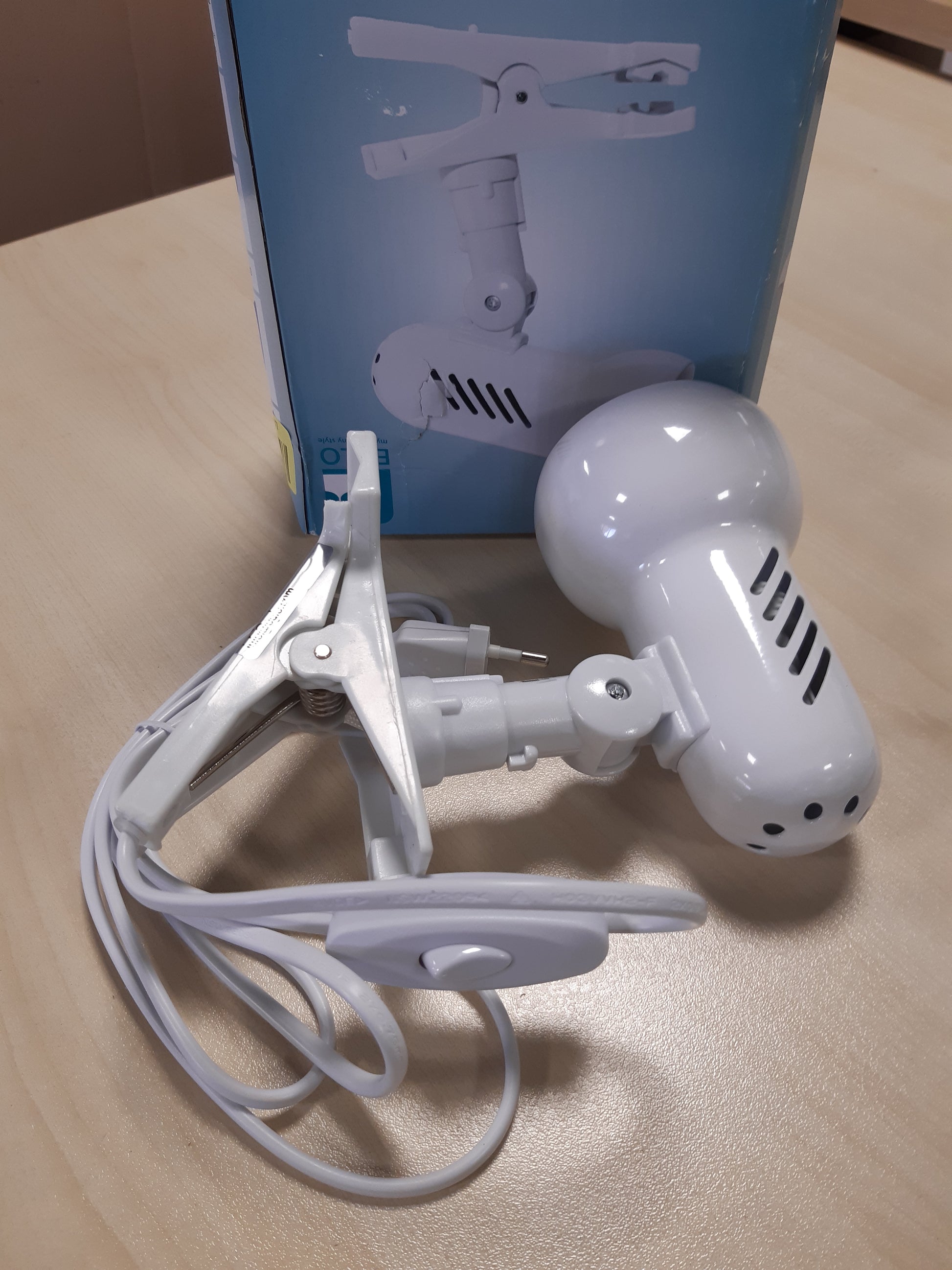 - Llamba e leximit me kapëse është e bërë nga çeliku dhe plastika e bardhë me dimensione 16 cm.