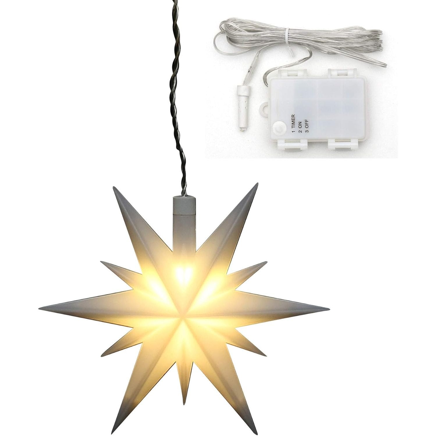 210167 - YLLI I KRISHTLINDJEVE plastik i bardhë, i përshtatshëm për përdorim të brendshëm dhe të jashtëm, me ndriçim LED dhe kohëmatës 6-orësh, funksionon me bateri. Përmasat: 13.5 x 5.5 x 12 cm.