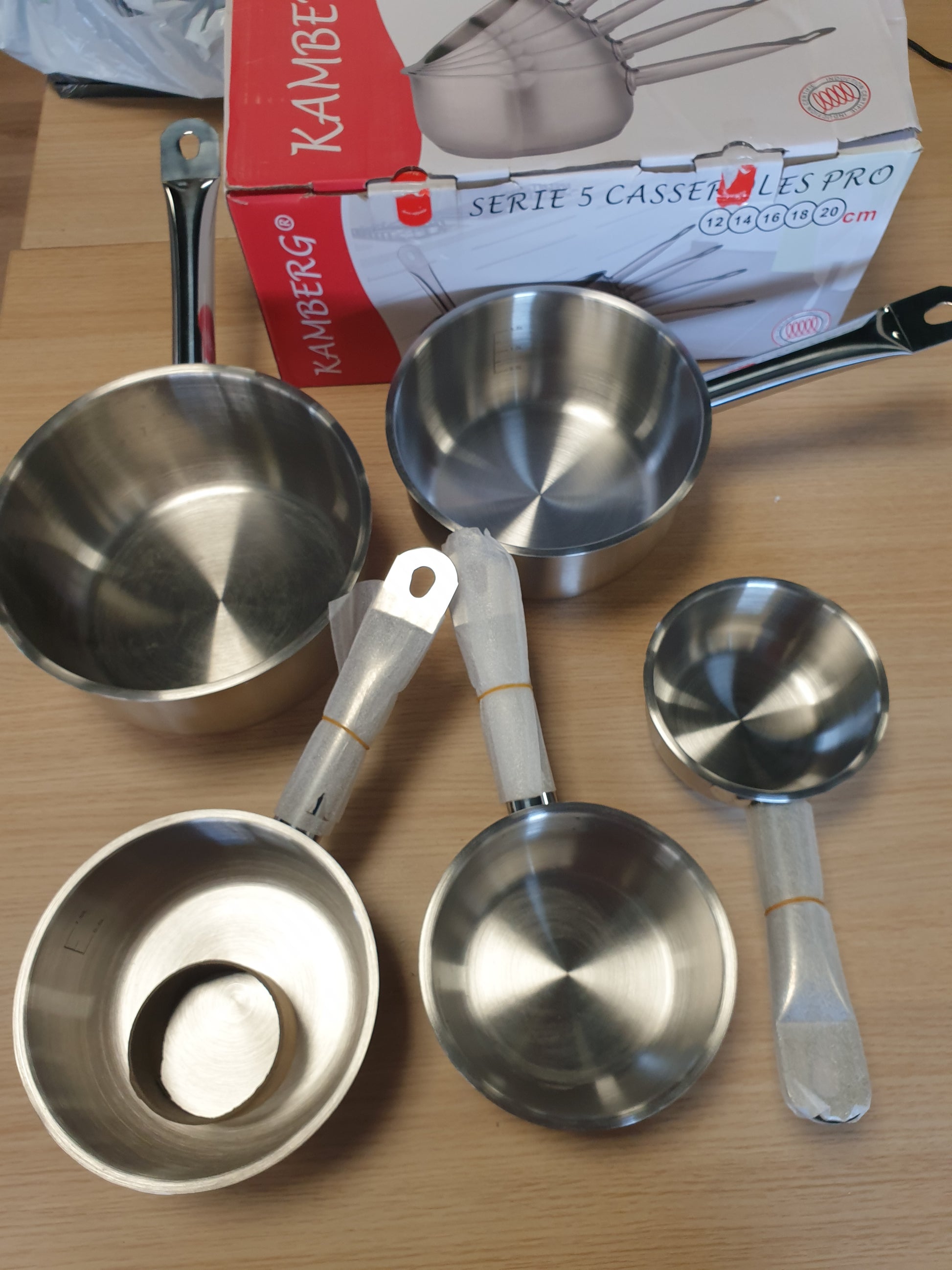 - Kamberg Pro Range përfshin një set me 5 tenxhere çeliku inox me përmasa 12/14/16/18/20 cm.