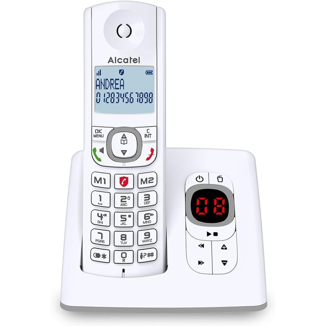128028 - ALCATEL - Telefon Fiks DECT F530 Voice me Sekretari, Funksion Bllokimi Thirrjesh, 2 Taste Memorjeje Direkte, Ekran i Madh me Ndriçim nga Prapa - i Bardhë/Gri - E përdorur. Baza për karikimin e telefonit nuk ndizet.
