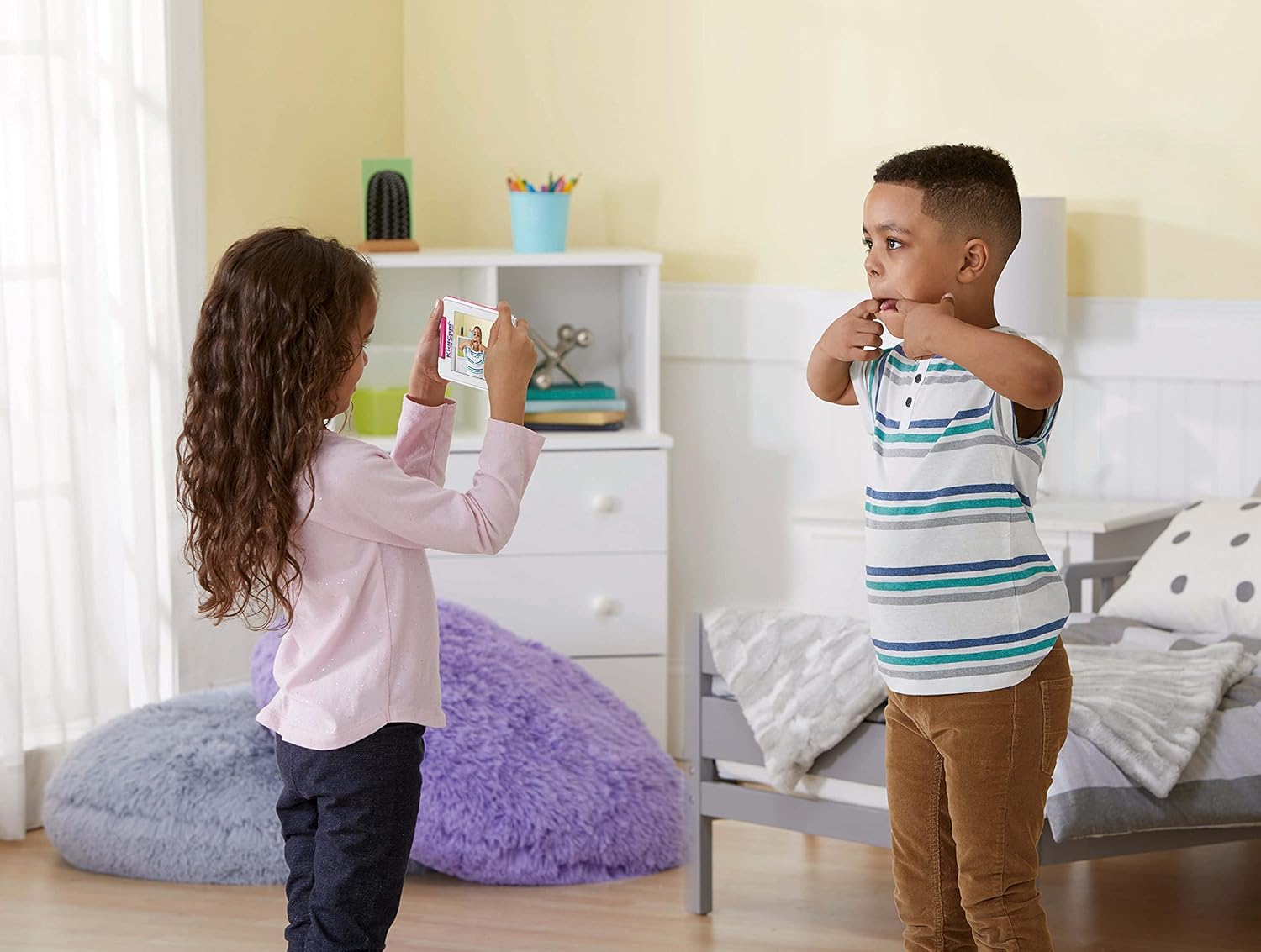 - Pajisje me ekran prekës 5 inç me efekte 3D dhe funksion zhbllokimi me gjeste, e projektuar për komunikimin e sigurt tekstual dhe videomesazhe me aplikacionin VTech KidConnect.
