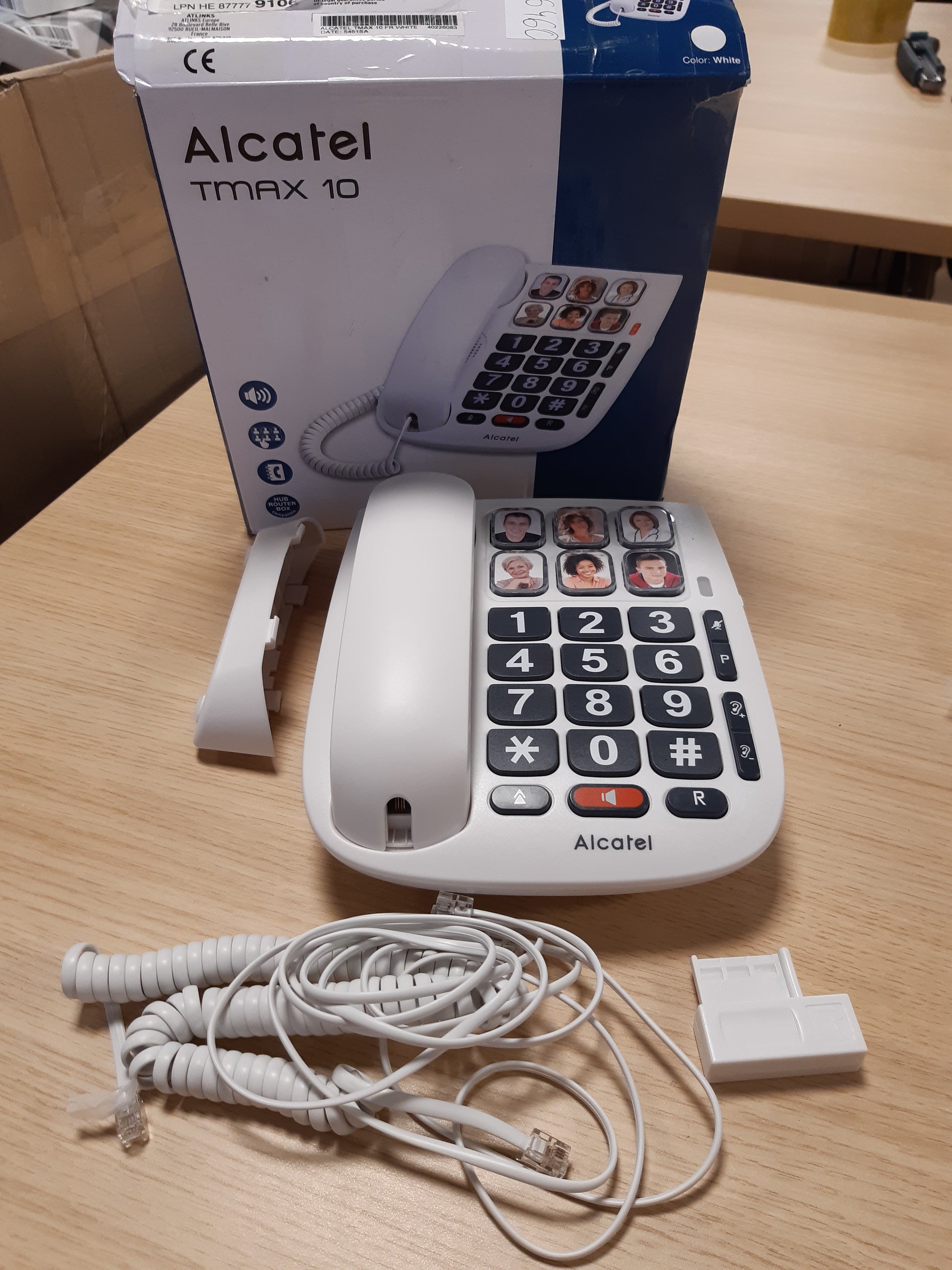 - Telefoni fiks me kabëll Alcatel TMAX 10 i përshtatshëm për të moshuarit me taste të mëdha dhe dritë treguese për thirrje hyrëse.