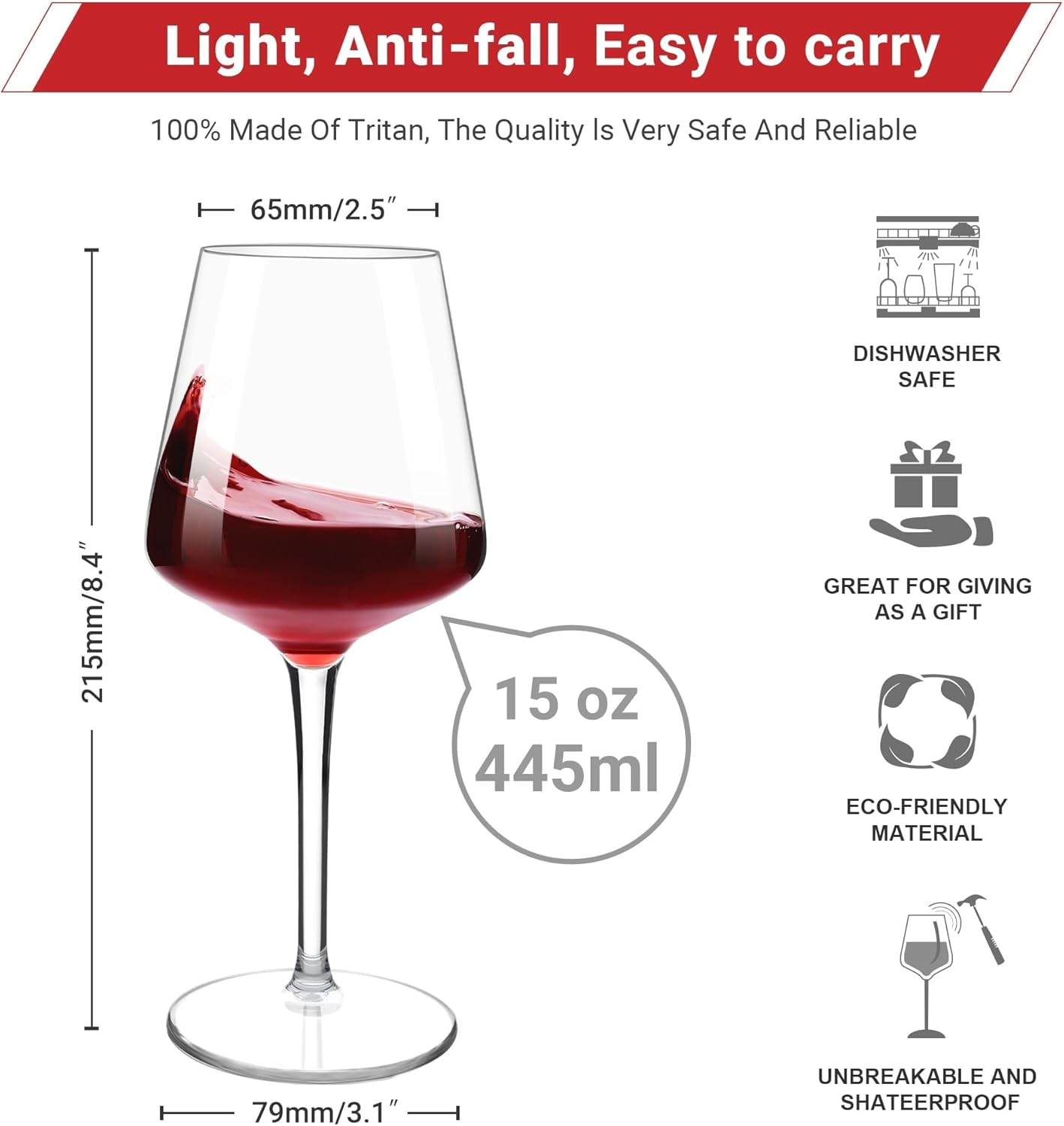 96603 - HAHASHOW Gotë Plastike për Verë të Bardhë Tritan, Set prej 4 Gotash për Verë të Kuqe, Kapacitet 445 ml, e Përshtatshme për Lavastovilje, për Festa në Kamping